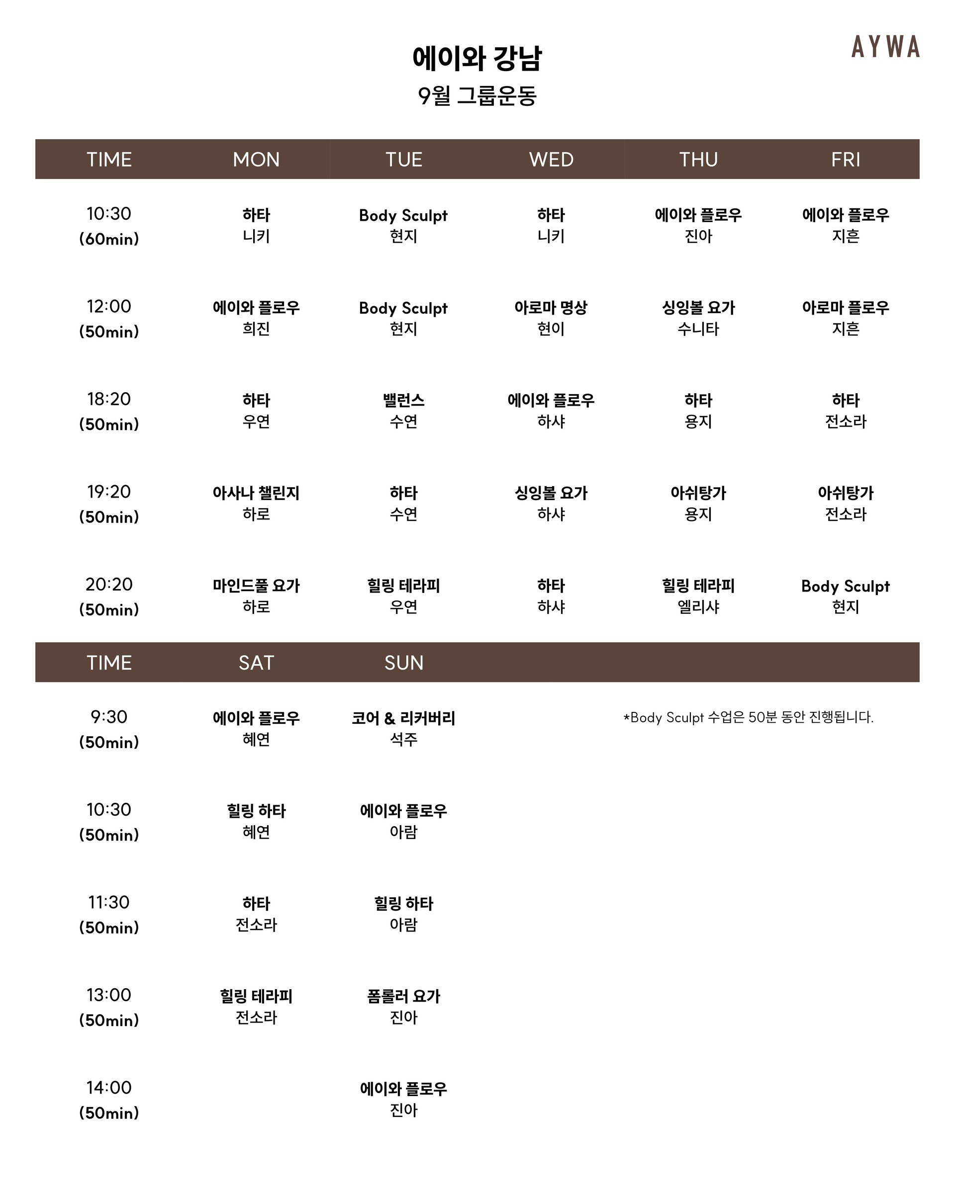 *Body Sculpt 수업은 50분 동안 진행됩니다.